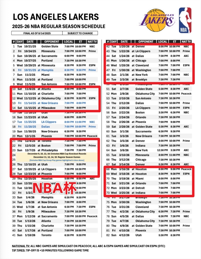 8月15日最新消息,洛杉矶湖人队正式发布了2023-24赛季的全部比赛安排。